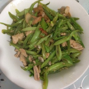 放入四季豆丝、青椒丝,加入适量的盐,放入蒜,翻炒一分钟出锅
