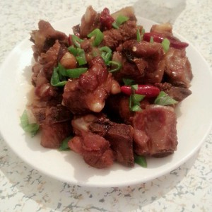 在锅中放入油,将葱姜蒜煸炒,再放入排骨翻炒依次放入白砂糖,酱油,辣椒,八角继续翻炒,添没过排骨的水煮二十分钟。