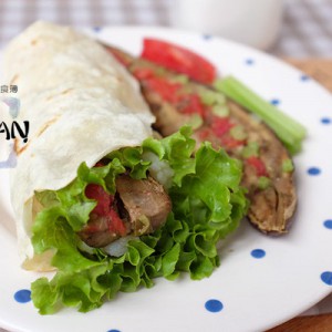 面饼铺开,放一大片生菜,抹一层土豆泥,放上半个烤好的茄子(可以把没用完的芹菜条再放几条,根据个人口味可再撒点黑胡椒等),卷起开吃咯!