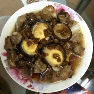 最后跟米饭一起放入电饭煲蒸,饭熟了排骨也熟了。最最后,调个汁淋到出锅后的排骨上!用切碎的香菇蒂用油小火过一下,闻到香味后放一点酱油,放一点生粉兑的水,煮到有点稠,然后就淋到香菇上。搞定!