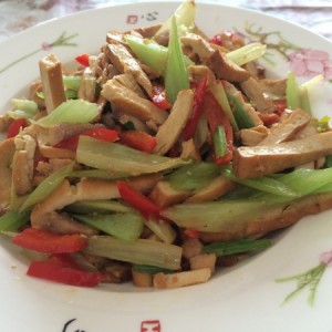 香干,辣椒切丝,芹菜斜切,瘦肉切好用生抽腌一下。下油锅炒,放少许盐
