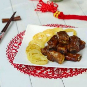 最后将煮好的排骨摆在土豆旁边,摆出一个漂亮的造型就可以上桌了哦!