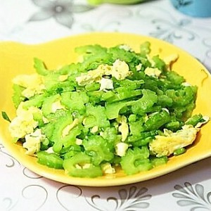 另起一锅,来一点油,蒜末爆香,放苦瓜,快熟时放入炒好的鸡蛋。关