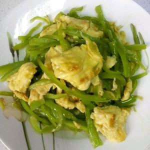 青椒去蒂,籽洗净。鸡蛋打入碗中。