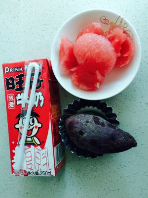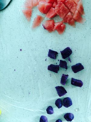 紫薯切小丁,,可以揉搓成圆球形状,西瓜切小丁。