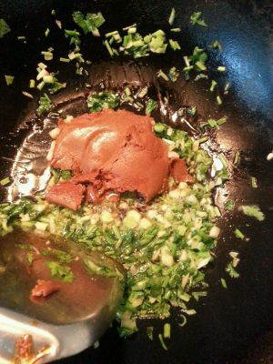 主要调味料,泰式黄咖喱酱,倒入锅中,一起炒出香味。