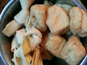 倒入豆腐泡和豆皮结。豆皮结是偶自己动手把豆皮剪长条,打成的结。不过超市里也有卖现成的。
