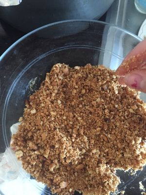 2:将消化饼干压碎,或放打汁机里搅碎。黄油25g融化或放微波炉里打热。再倒入碎的消化饼干搅拌
