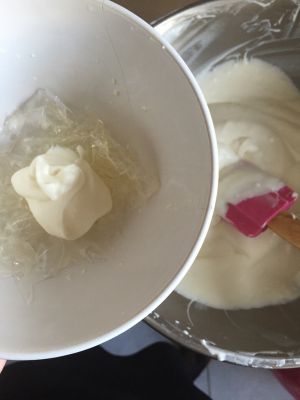 11:将开水烧开,倒入大碗里,慢慢预热吉力丁。融化好后倒回料中