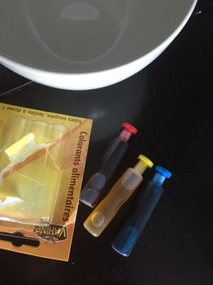 12:使用色素开始挑颜色。红色滴两滴。黄色加蓝色是绿色。黄色。蓝色。