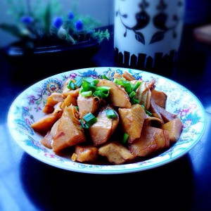 第二步:把油锅烧至七成热,将春笋倒入煸炒片刻再依次加入黄酒、生抽、老抽、白糖、水加至到和笋一般平再焖烧至春笋水分基本收干后加入葱花即可装盘。