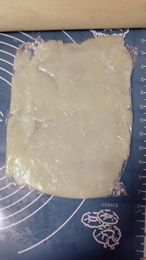 蒸熟后,取出面,如果是全糯米粉,熟面会很稀,一扯很长,没有关系的。如果是两种粉,蒸熟后,不太粘,易折断。然后,案板上抹油,我这种不粘垫不用抹油。保鲜膜抹油,盖在面上,擀成长方形。