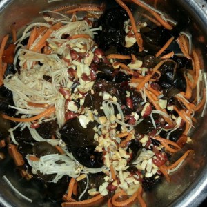 锅里烧开水,下入金针菇用水焯一下。焯完过一下凉水。焯金针菇的开水留下放入木耳进行泡发(节约用水),泡发后在清洗即可。胡萝卜削皮洗净檫丝。(以上步骤忘记拍片)