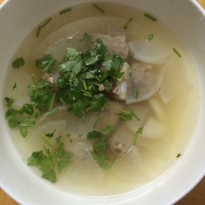 第四:熬好后放入萝卜煮十分钟,加入适量盐!停火出锅加入香菜,放点香油即可!味道美营养鲜!适合大人也适合宝宝!