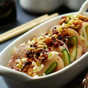 把蒜泥、葱末、朝天椒末、香菜末、生抽、白醋、蚝油、糖、花椒油、香油、鸡粉等调料拌匀,成料汁浇在肉上面,大功告成。