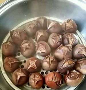 把板栗放进锅里大概蒸20分钟,看到裂口,