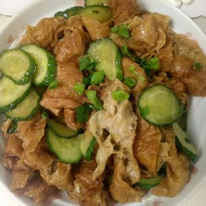 放入黄瓜,煸炒,放盐,炒一下关火。出锅前淋上少许香油。