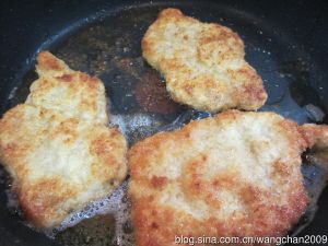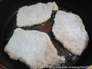 腌好的猪扒依次沾上玉米淀粉,蛋液,面包糠