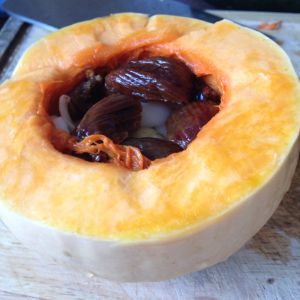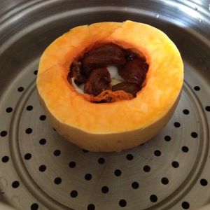 南瓜不用去皮,切成碗大小,挖去籽。把蜜枣和泡软了的百合装进去。