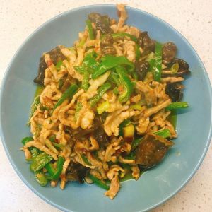 将热锅里倒上适量的菜籽油,五分热的时候放入码好味儿的肉丝,快速翻炒,肉丝颜色变浅的时候在锅里加入切好的葱姜蒜,继续翻炒,倒入提前煸炒的青椒丝和木耳,翻炒均匀一点,加入适量的盐,继续翻炒,然后关火,加入适量味精,翻炒均匀一点,盛盘起锅