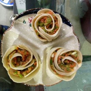 面下面剂,五个一组排成排,中间用筷子压一下,放上馅料卷起,从中间切断,整形,上锅蒸20分钟!
