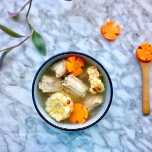 排骨煮30分钟后把切好的玉米和胡萝卜全部放入锅中,继续煮20至30分钟。(具体煮多久要看排骨的大小和玉米的鲜嫩有关,如果排骨比较粗肉厚煮的时间久一点,玉米尽量不要选太嫩或者太老的,太嫩煮了玉米粒容易瘪,太老的口感差,买的时候最好扒开玉米皮挑一挑)