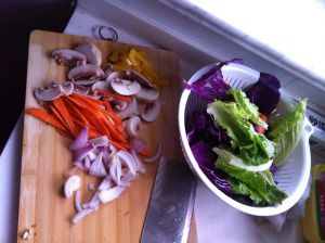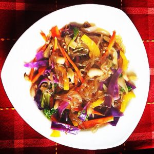 待蔬菜瘪掉后加料酒、生抽,下粉丝