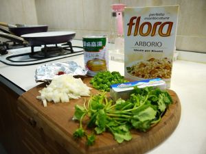 食材照片:荷蘭甜豆(別種豆子也可以,添色用)/芫荽/蝦子(龍蝦海蝦明蝦白蝦,只要新鮮都好)/洋蔥半個/義大利燉飯用米二杯(200CC杯子的大小)