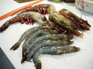先用大火把蝦子煎五分熟,蝦子煎好後先放一邊。