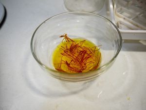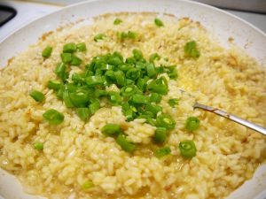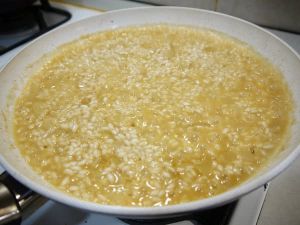 等到米的口感煮到快接近你喜歡的硬度了,下蕃紅花水,攪勻,確認米粒都染上了蕃紅花的鮮黃色。