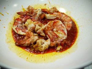 把蝦子倒入鍋裡,再加熱至約八分熟。不要攪,怕蝦子不熟加蓋加熱就好,不然待會賣相不好看。(當然,要攪也可以,不會影響味道) 然後熄火把煮好的北非辣醬大蝦放在一旁備用。