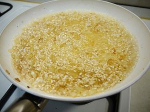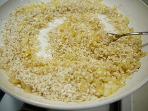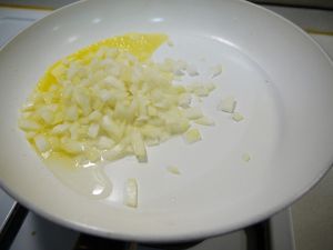 橄欖油加入30公克奶油,小火加熱,同時丟入切碎的洋蔥爆香煮透明。下奶油時要注意火候,不要太大火,不然奶油容易焦掉。