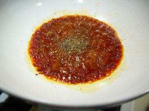 下蕃茄糊,個人喜好加入小茴香,黑胡椒,百里香,炒熱攪勻。