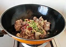 炒至鸭子出油后,放入葱、姜、辣椒炒出香味