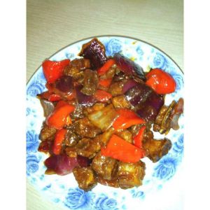 先将酱汁用来炒排骨,6分钟后倒入洋葱、椒片一起炒8分钟左右装碟即可