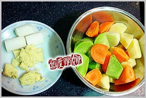羊肉一边炖着,一边将其他材料处理好。葱切段,姜切大块拍碎,萝卜土豆等去皮后切大块。