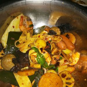 4、开火到油、把虾先煸炒熟盛出来。再倒油把蒜、姜煸香、接着倒入麻辣香锅底料炒、然后把所有东西放锅里一起煸炒出锅就可以啦