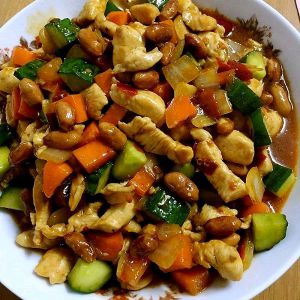 准备食材,黄瓜,胡萝卜,花生米,鸡胸肉,蒜,姜片,葱段