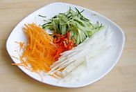 将紫晶藻、白菜丝、胡萝卜丝、黄瓜丝放入碗中,倒入调料汁拌匀即可