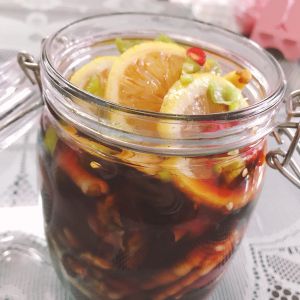 密封罐里倒入200ml醋,200ml生抽,一点点糖,一点点盐