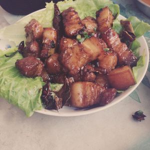 然后放入五花肉,翻炒至肉块表面变色,去油