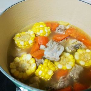 排骨冷水焯水后洗净,砂锅中放入排骨,玉米,葱结,姜蒜和水,加1勺料酒,大火煮沸后小火加盖炖一个半小时。
