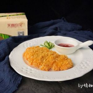 准备好:面包糠、面粉、鸡蛋打散搅拌均匀