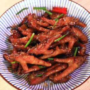 锅烧热开小火,倒入油,放入冰糖,等到冰糖融化为泡沫状时倒入鸡爪翻炒上色