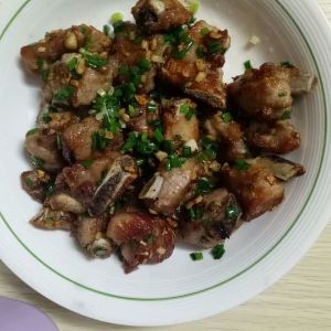 将蒜末,姜末下锅炒一下。再将煎好的排骨倒进锅里翻炒一分钟关火,再下葱花跟椒盐粉倒在排骨上翻一翻就可以了