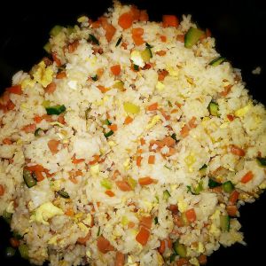 7.锅中烧油,油热放入胡萝卜翻炒,放一点水煮,继续翻炒,然后放入火腿肠,黄瓜,继续翻炒放入生抽翻炒,放入鸡蛋翻炒,加入米饭翻炒,盐适量加,继续翻炒,胡萝卜软就可以出锅了!