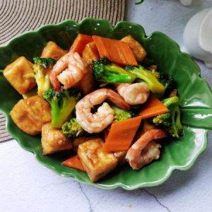加入生抽,白糖,耗油一点点,鸡精调味,出锅前放入虾仁,有生抽和耗油,盐可以不用加,最后大火收汁,习惯勾芡的做法可以用裹豆腐剩下的生粉少勾一下汤汁
