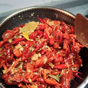 倒入小龙虾,翻炒均匀,炒两分钟,加入辣椒水!加一瓶啤酒继续煮