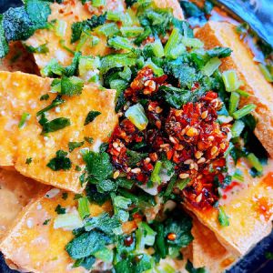 将调好的两种料汁淋入炸好的豆腐上,撒上香菜和葱花,淋入蒜汁和辣椒油就可以了;
