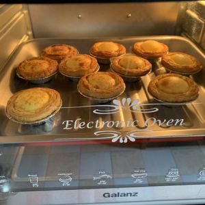 在烤盘上摆好蛋挞皮,蛋挞液倒入。9分满
